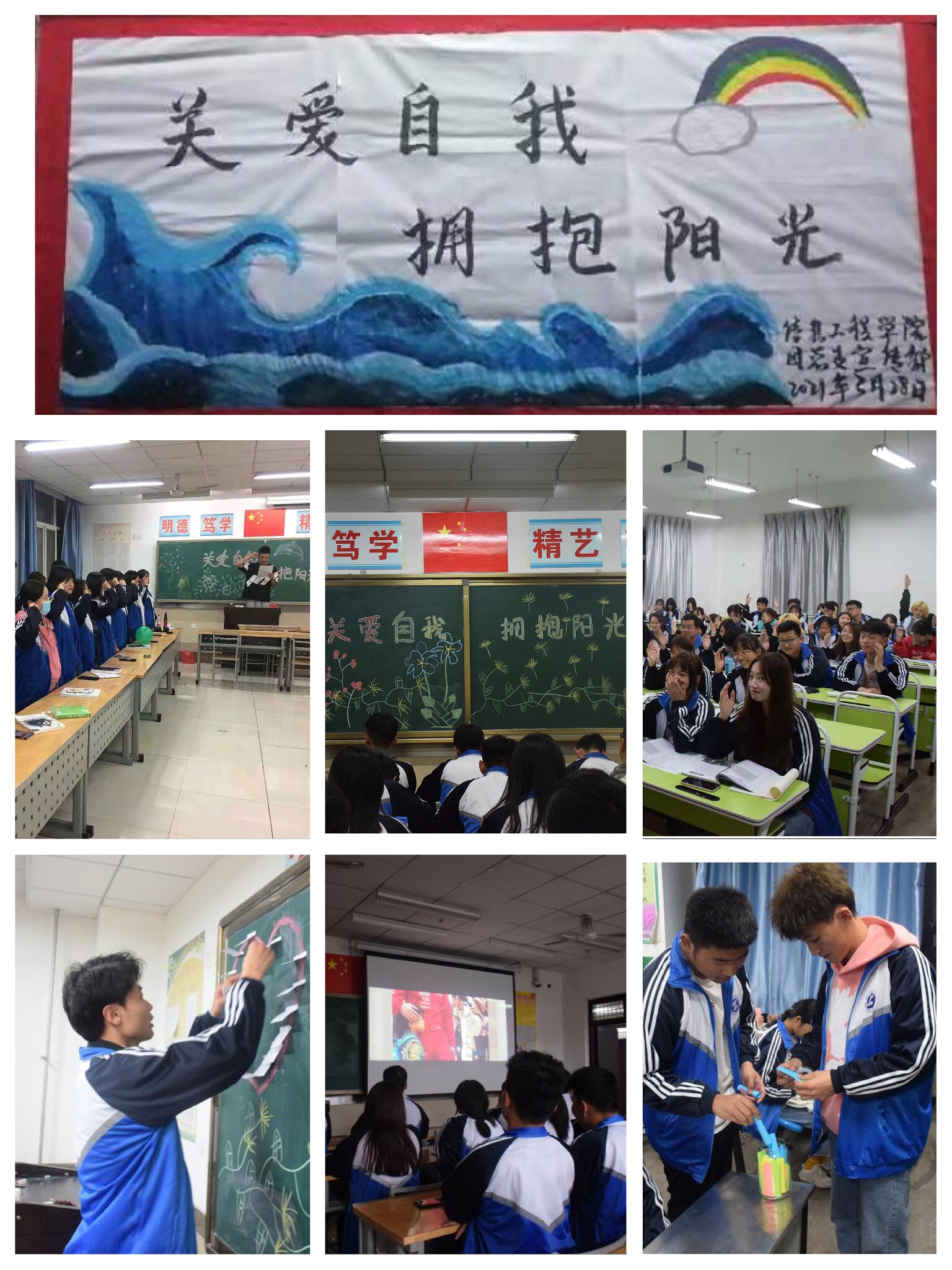 ——高效率推动,花样开展主题班会。3月28日,根据心理中心安排,信息学院策划部署,紧紧围绕 “关爱自我,拥抱阳光”这一主题,举办了包括一份倡议书、一期宣传展板、一次星语星愿、一部心理电影、一次漂流瓶活动、一期心理主题班会、一次趣味活动的学生喜闻乐见的主题班会活动,成效良好。