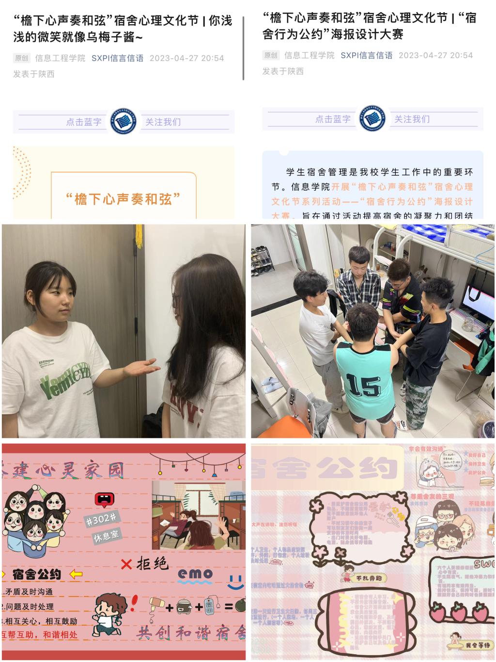 在“心理健康进宿舍”宣传教育活动中,辅导员、学生干部和学生党员深入宿舍开展“常见心理问题疏导”“心理危机预防”主题宣讲,推动心理健康教育与大兴调查研究紧密结合。在“寝室遇见爱”实践活动中,学生通过“相‘寓’是福”、“知你知我”、“戴高帽儿”等特色游戏,学会了互相欣赏和换位思考。“浅浅的微笑就像乌梅子酱”宿舍集体微笑摄影展选取并纪录了学生宿舍生活的开心瞬间,展示宿舍最温馨的一面。“宿舍行为公约”海报设计大赛要求各宿舍制定行为公约,帮助学生以公约形式规范自身的行为举止,营造健康的宿舍氛围。