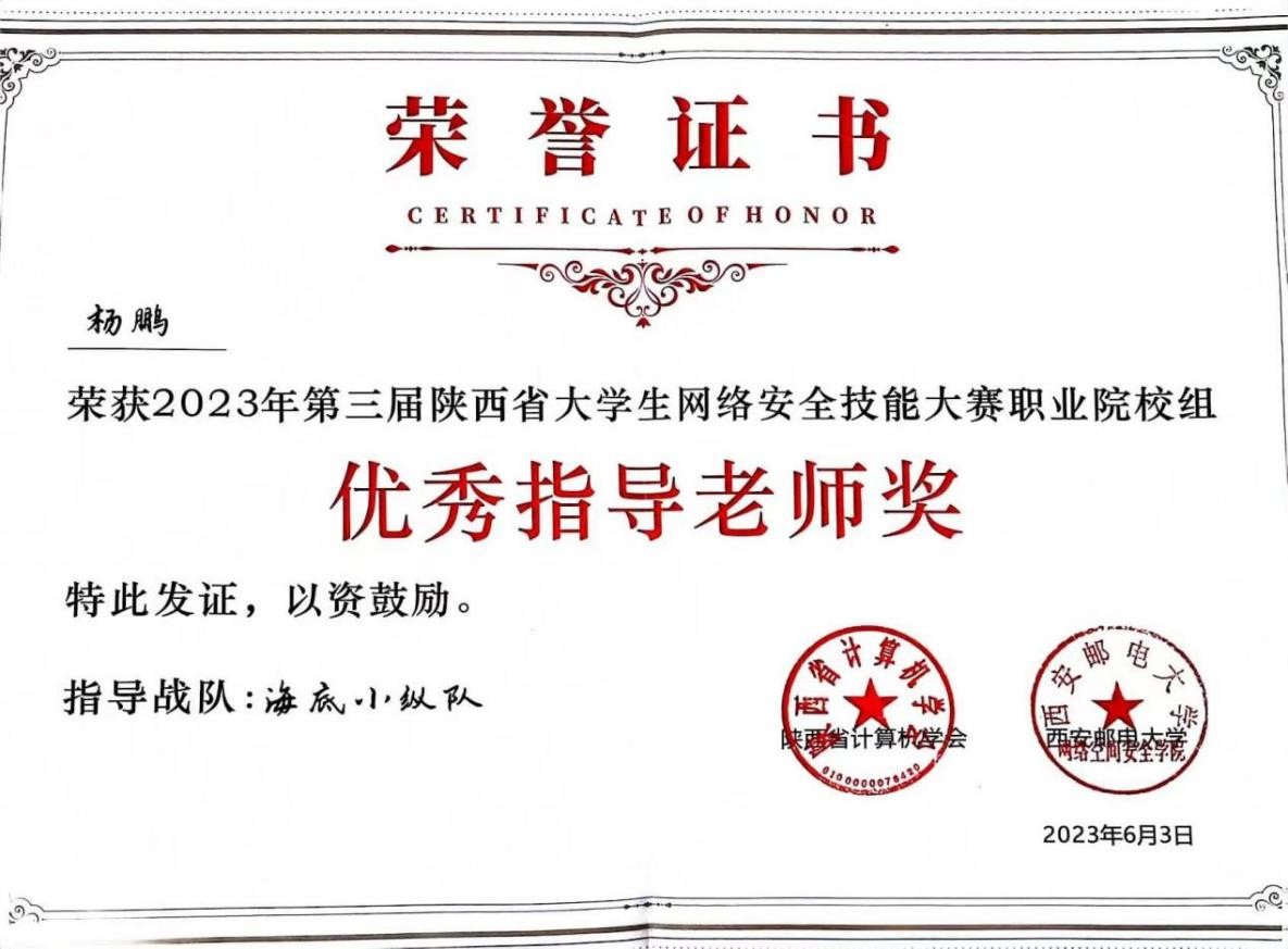 6月3日,由陕西省计算机学会主办,西安邮电大学网络空间安全学院、西安四叶草信息技术有限公司承办的2023年第三届陕西省大学生网络安全技能大赛-职业院校组在线上举行,来自全国150个高校队伍一较高下,由我校乐鱼网页版登录入口杨鹏老师指导的6名同学(两个战队),荣获一等奖和优秀奖各一项。