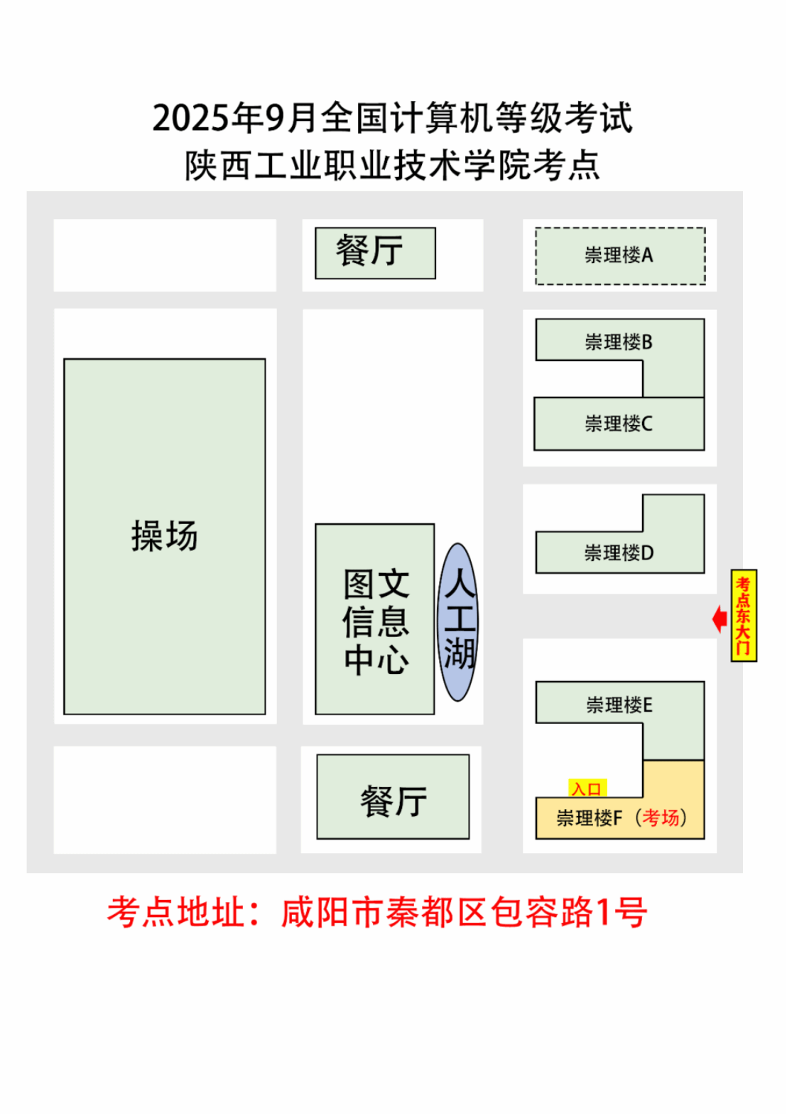 陕西工业职业技术学院现更名为陕西工业职业技术大学,全国计算机等级考试考点地址不变。考点地址位于咸阳市秦都区包容路1号,可选乘咸阳市14路公交车到达“陕西工院(经开校区)”站下车,从东大门进入学校,建议考生计划好时间,提前出行。