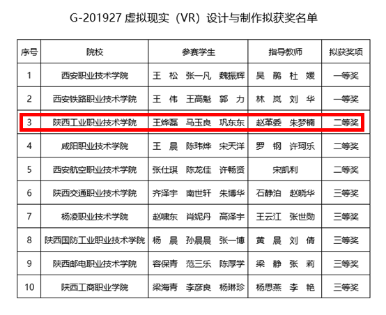 3月27日,2019年陕西省职业院校技能大赛“虚拟现实(VR)设计与制作”赛项比赛在西安职业技术学院落下帷幕。经过一天的激烈角逐,由我院乐鱼网页版登录入口教师赵革委、朱梦楠指导,软件1704班马玉良、王烨磊和数媒1704班巩东东三名同学组成的代表队荣获团体二等奖。