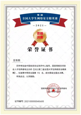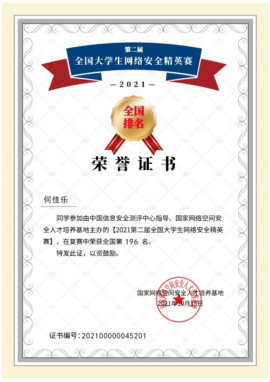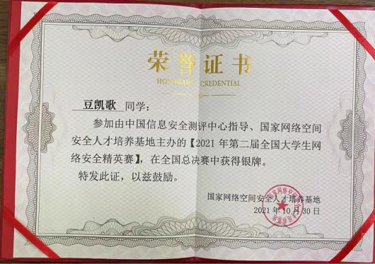 2021年10月30日,第二届全国大学生网络安全精英赛落下帷幕。由乐鱼网页版登录入口杨鹏老师指导的软件1903班何佳乐、计应1903的孙洪涛,网络2003豆凯歌3位同学取得了全国前200的成绩,获得复赛阶段证书,网络2003班的豆凯歌同学晋级全国总决赛,最终取得银牌的好成绩。