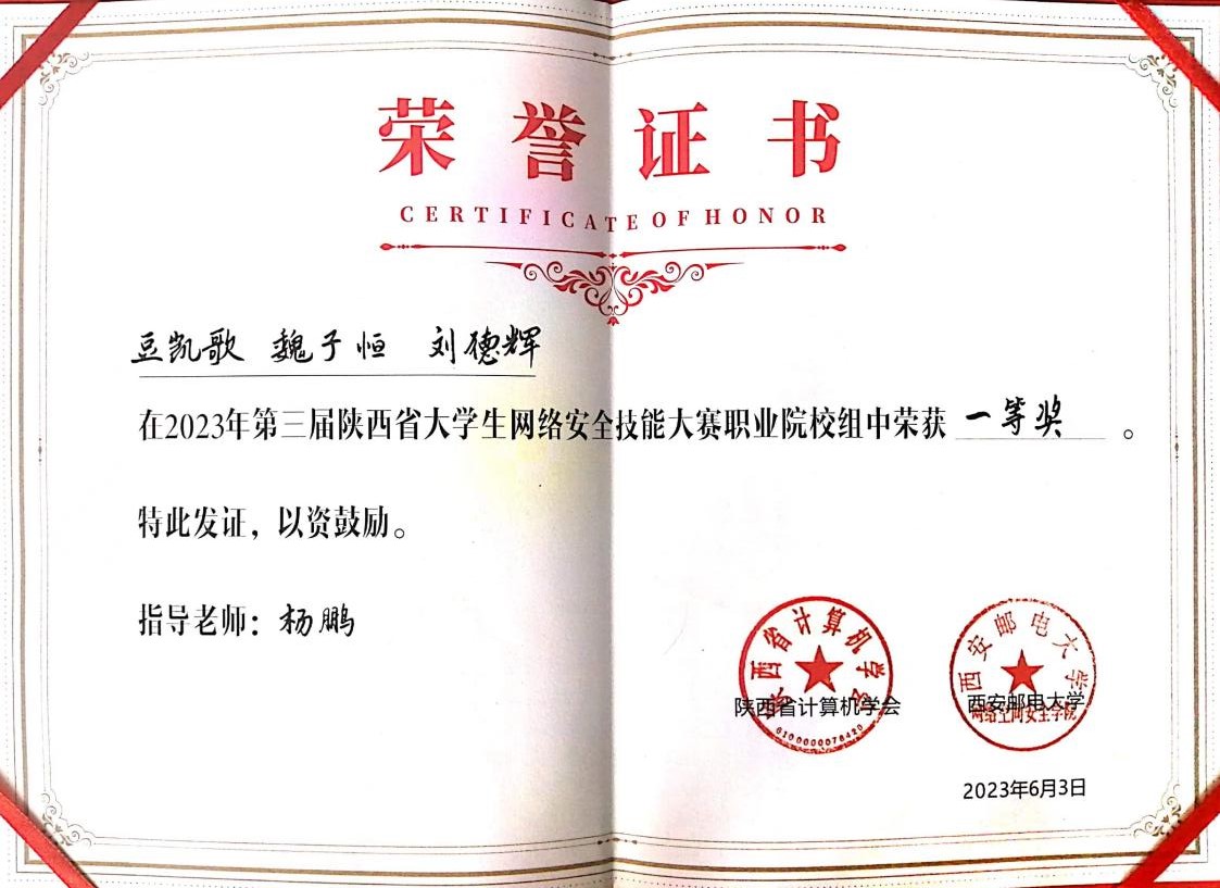 6月3日,由陕西省计算机学会主办,西安邮电大学网络空间安全学院、西安四叶草信息技术有限公司承办的2023年第三届陕西省大学生网络安全技能大赛-职业院校组在线上举行,来自全国150个高校队伍一较高下,由我校乐鱼网页版登录入口杨鹏老师指导的6名同学(两个战队),荣获一等奖和优秀奖各一项。