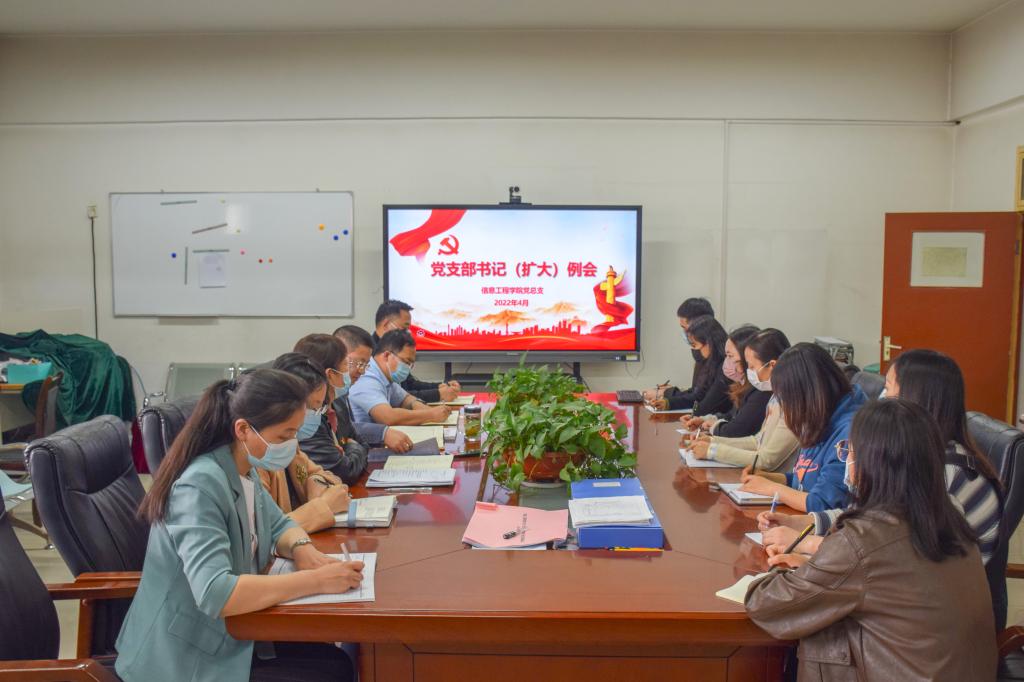 为进一步推进学院基层党组织工作不断创新、党务工作研究部署、党建工作经验交流,推动党建工作层次整体提升,4月12日下午,乐鱼网页版登录入口党总支在崇文楼806室召开党支部书记(扩大)例会。信息学院党总支书记闫军、副书记郭新玲、各党支部书记、总支和支部委员等参加,会议由郭新玲同志主持。